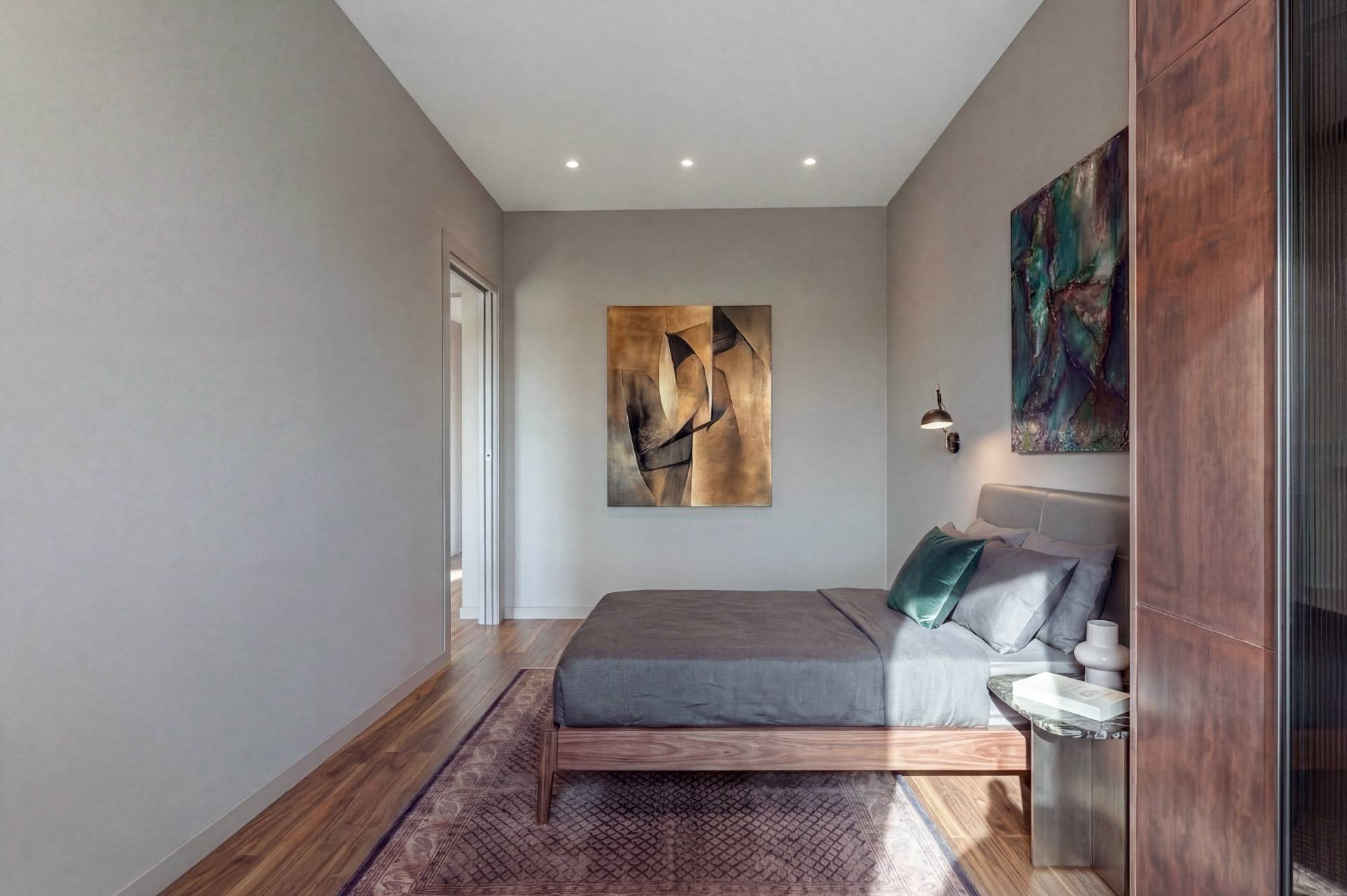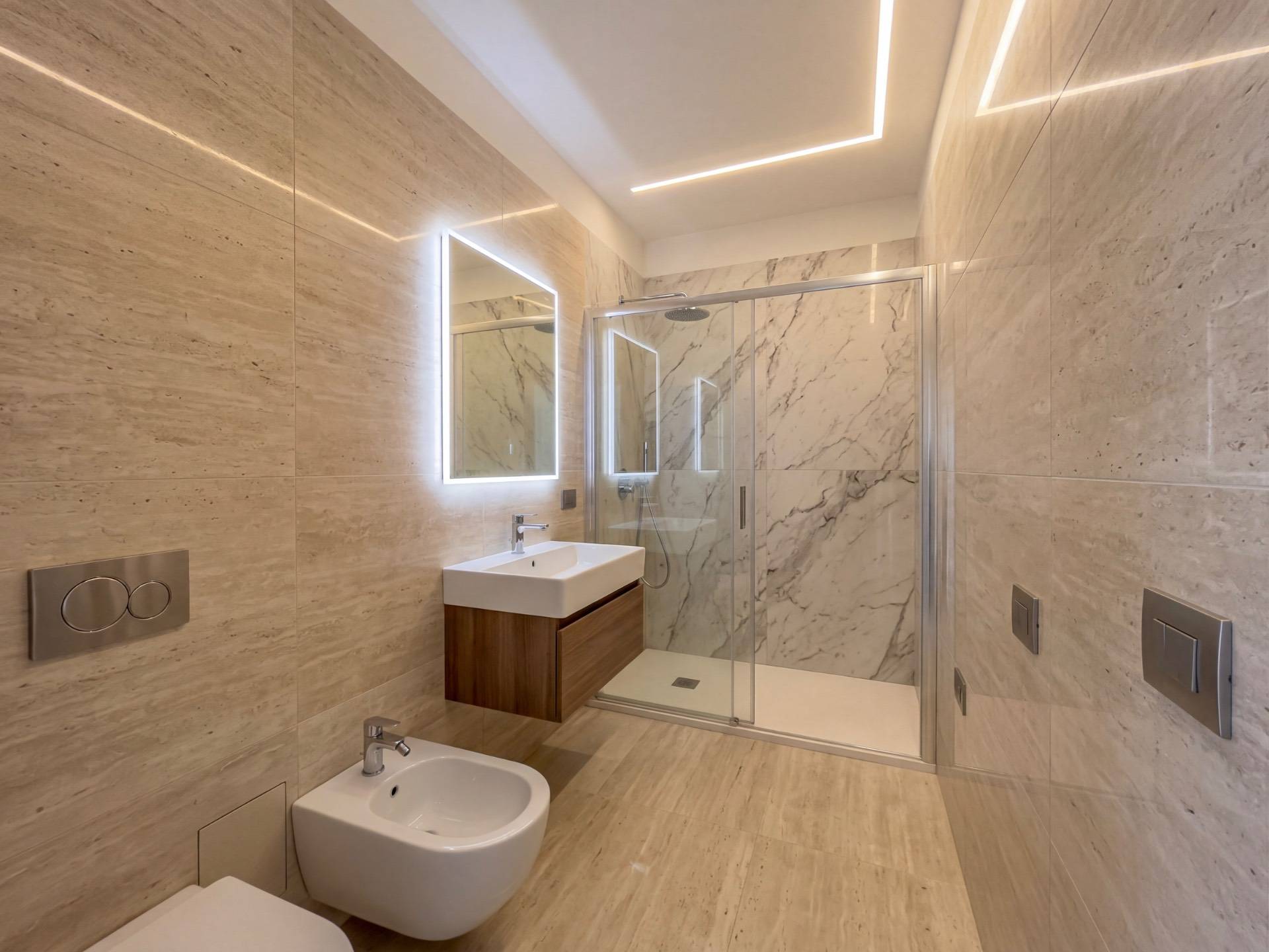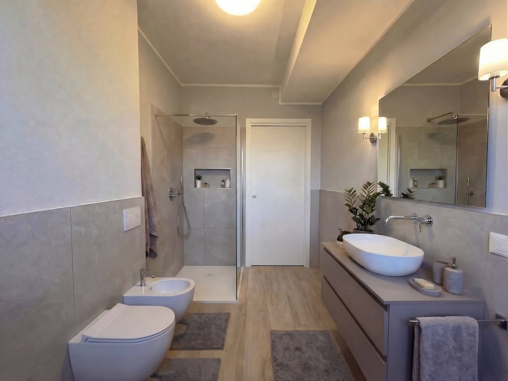 Il disimpegno conduce alla zona notte, composta dalla camera matrimoniale, seconda camera da letto e bagno con doccia walk-in, con sanitari sospesi e scalda salviette.